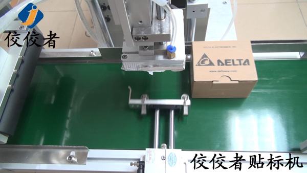 然后,標(biāo)簽會(huì)被轉(zhuǎn)送到輸送帶的上方,等產(chǎn)品經(jīng)過(guò)時(shí)準(zhǔn)確貼上標(biāo)簽,如下圖: