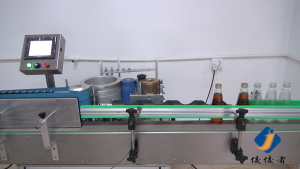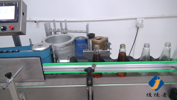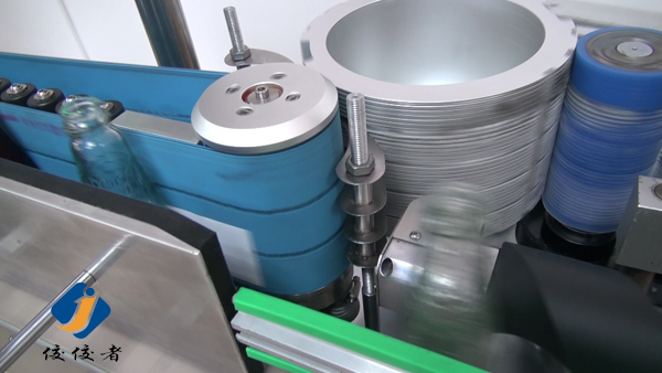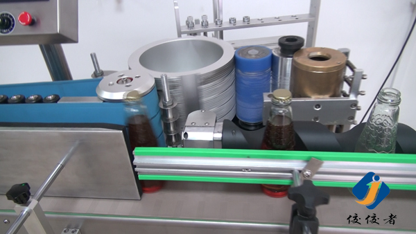 看到上圖中玻璃瓶子后面有一條螺旋狀黑色柱體了嗎?那個圓柱體就把瓶子們的間距調(diào)節(jié)得與出標頻率吻合,瓶子們被一個個送到下圖這個傳送帶上進行貼標,傳送帶會準確地把已經(jīng)糊好漿糊的標簽給貼上瓶子,如下圖: