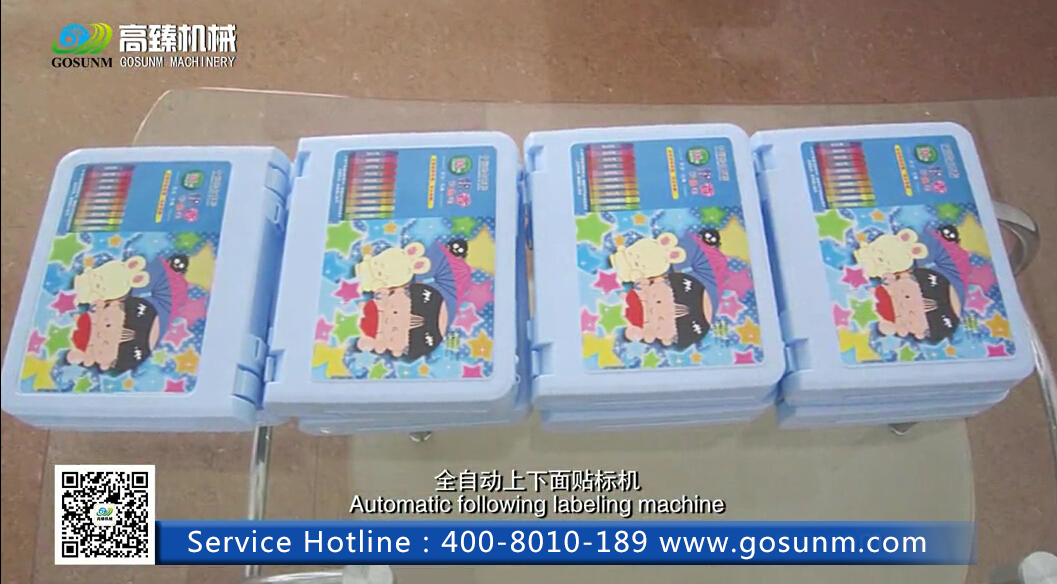 全自動上下面貼標機屬于平面貼標機系列,適用于規則性長方形、正方形物體的上下面貼標,可一次性貼上下面兩種標簽,如盒子上下面貼標;組合機型可單獨分開,轉換成兩臺通用型平面貼標機。下面我們用平常經常看到的彩筆文具盒來介紹該機器的操作過程吧。