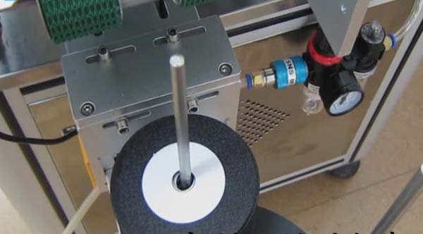 上圖是產品放好后.在傳送帶上運動的過程.前面有一個送料機構.可一次放幾10張砂輪片.設備自動一片一片的送上傳送帶.然后送上去貼不干膠.
